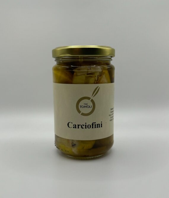 Carciofini sott’olio lavorati rigorosamente a mano. I cuori di carciofo sono prima messi a bagno in acqua, succo di limone ed aceto. Successivamnete sbollentati per pochi minuti prima di essere invasettati con aglio, qualche foglia di menta e olio extravergine di oliva Pugliese. I carciofini sott’olio sono l’ideale per condire insalate di riso o di pasta ed accompagnare antipasti ed aperitivi.